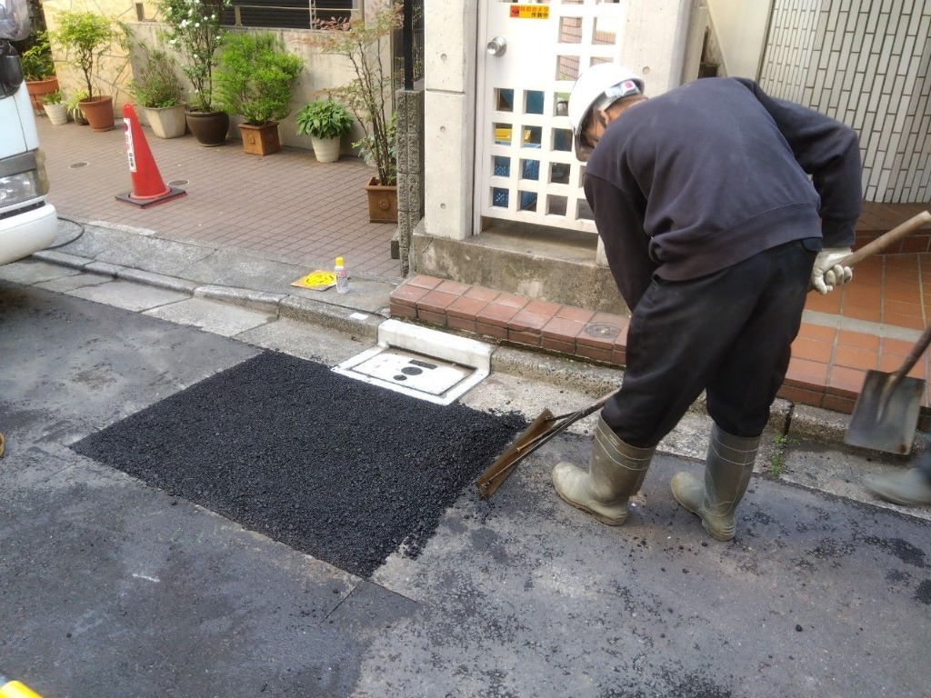 道路工事で地面に穴を掘り、土などを埋め戻しをしながら転圧した後は、アスファルト舗装(今回は仮舗装)をします。